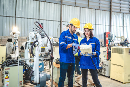 Engineer people service robot working in automation factory. Worker team in safety suit work robotic arm software programming or replacing part in automated manufacturing industry technology