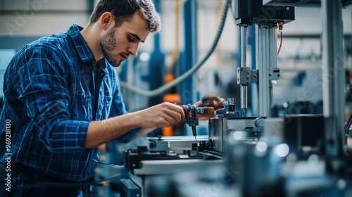 engineer, calibration, manufacturing, workshop, precision, sharpened, machine, tool, industrial, male, technician, equipment, measurement, technology, workspace, quality, production, checking, professional, skill, blue, shirt, machinery, workbench, safety, inspection, detail, process, assembly, mechanical, environment, factory, labor, craftsmanship, innovation, design, accuracy, performance, task, industry, engineering, check, technical, skilled