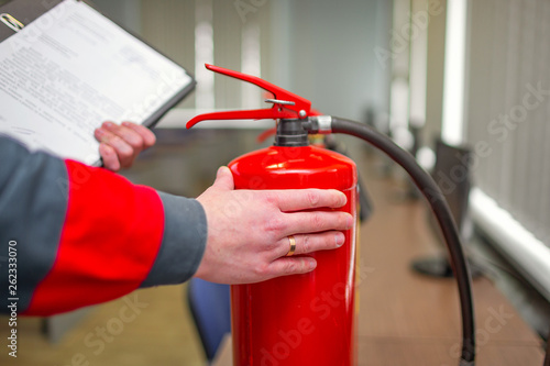 fire, extinguisher, safety, portable, inspection, industrial, control, alarm, person, security, red, professional, fighting, service, equipment, holding, danger, protection, emergency, hazard, prevention, precaution, system, office, technology, industry, smoke, measurement, pressure, valva, gauge, firefighter, extinguish, watercourse, sprinkler, hydrant, check, male, man, human, object, metal, spray, protect, cylinder, examine, prevent, warning, analysing, rescue