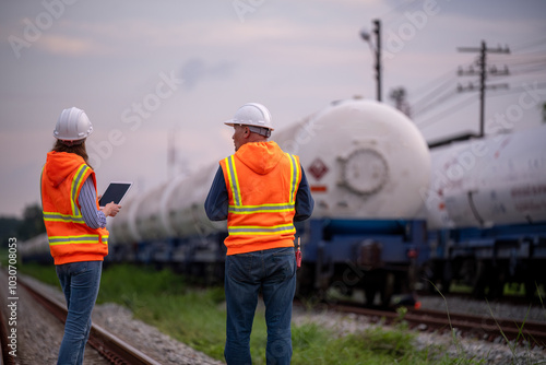 Engineer railway engaged in discussion or inspection maintenance work greenery and gas or oil power industrial or transportation setting in the rail train import export logistics industry concept.