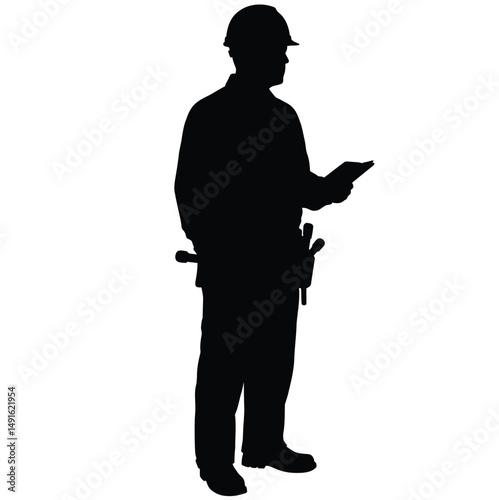 engineer, silhouette, men at work, construction, helmet, hard hat, plan, tablet, black, white, vector, clip art, illustration, graphic, art, design, isolated, shape, outline, person, male, standing, holding, tool, belt, work, site, project, architect, builder, technical, professional, job, occupation, uniform, safety, inspect, supervise, draft, blueprint