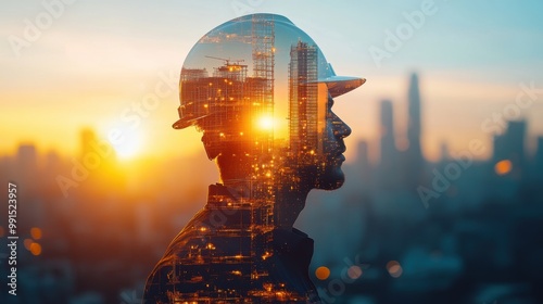 Engineer silhouette with cityscape and sunset background, double exposure effect.