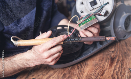 Engineer soldering circuit board of vacuum cleaner.