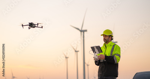 Engineer Specialists Pilot Drone on Wind Turbine Farm. Architectural Engineer and Safety Engineering Inspector Fly Drone at industrial plant.