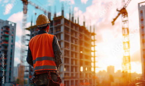 Engineer standing and supervising construction work The background is a building under construction