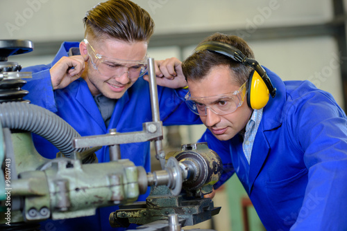 machine, finger, ear, man, male, machinery, knob, action, steel, turning, technology, industrial, controlling, engineer, coat, equipment, hand, earmuffs, noisy, painful, goggles, unprepared, noise, loud, block, apprentice, instructor