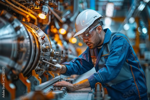 Engineer working on industrial machinery in factory, wearing safety gear. Engineering, technology, and industrial work concept. Horizontal.