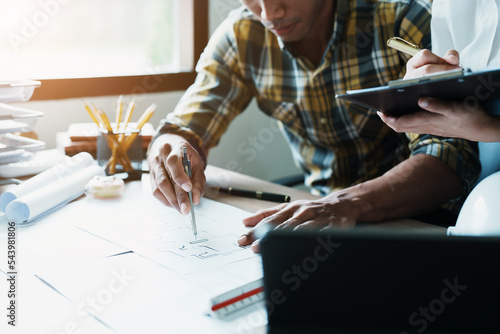 Engineers are consulting the team to design an architectural structure for clients with blueprints and building models to work at office