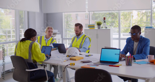engineer, uniform, walking, office, greeting, colleague, industrial, technician, reflective, hard hat, working, modern, factory, workspace, african, afro, caucasian, diverse, people, architect, architecture, blueprint, brainstorming, business, communication, construction, contractor, desk, development, drawing, engineering, foreman, industry, man, manager, meeting, occupation, paper, partner, plan, professional, project, safety, table, team, teamwork, together, work, men at work