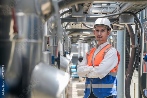 Engineers inspect gas and water pipes for power and cooling in industrial and building systems. workers in safety gear work seriously in oil and gas refining plant with pipes connecting to machinery.