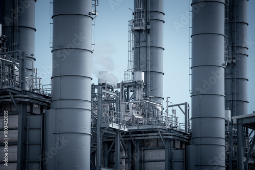 Engineers wearing safety gear, including hard hats examining survey a large blueprint tablet standing industrial facility gas or oil refinery engaged in a job requires high safety standards concept