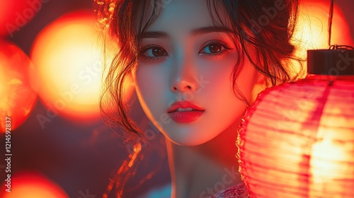 portrait, woman, girl, beauty, face, asian, lantern, red, light, glowing, model, eye, hair, skin, make-up, fashion, style, photo, photo, image, picture, art, artistic, aesthetic, beautiful, elegant, mysterious, intriguing, captivating, charming, alluring, attractive, gorgeous, radiant, aglow, vibrant, dramatic, colourful, mood, expression, pose, lip, make-up, head, person, coiffure, glamour, people, 1
