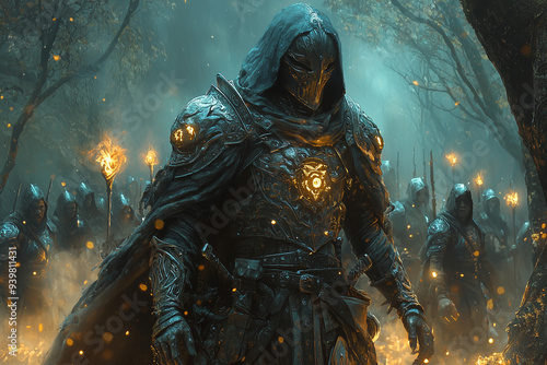 hooded, commander, enigmatic, armored, army, misty, forest, twilight, leader, fierce, powerful, mythical, legendary, shadowy, supernatural, commanding, dark, ominous, epic, dangerous, hero, villain, shadow, soldier, sword, war, intimidating, menacing, eerie, vigilant, armoring, battle, mysterious