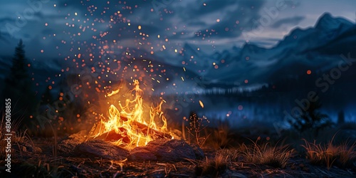 campfire, night, spark, flames, mountain, darkness, campground, glow, fire, camping, wilderness, adventure, nature, night sky, lively, warmth, balefire, explore, get-away, wild, solitude, evening, fiery, ember, sparkle, serene, outdoors, light, dusk, tent, recreation, expedition, relaxation, burn, calmness, escape, spark, gloaming