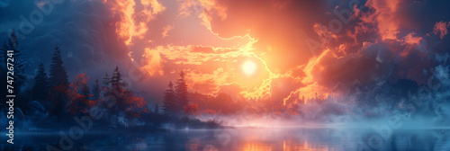 Enigmatic sunset over misty lake with silhouetted trees. Digital art depiction of a fiery sky and tranquil waters. Mystery and wonder concept. Design for poster, wallpaper, and print.