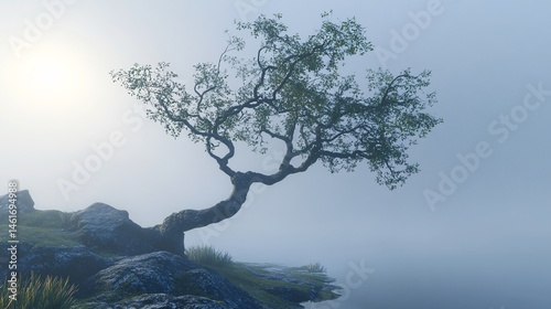 Enigmatic Tree with Twisted Branches Standing in Mystical Fog