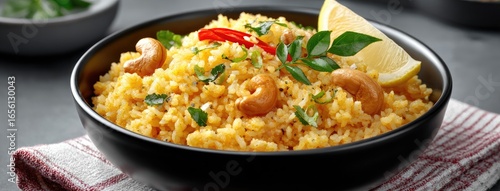 Enjoy a bowl of flavorful yellow pongal rice topped with nuts and fresh herbs, complemented by a slice of lemon and pita bread