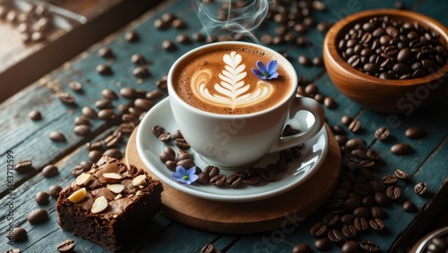 Enjoy a cappuccino alongside sweet chocolate brownies on a wood table, with a milk-topped latte art and roasted coffee beans in the background