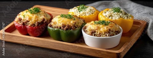 Enjoy a colorful assortment of stuffed bell peppers featuring ground beef, rice, and melted cheese served on a rustic wooden tray