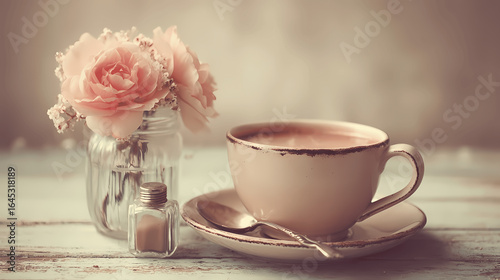 Enjoy a peaceful morning with coffee and a beautiful flower arrangement.