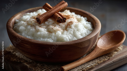 Enjoy creamy rice pudding sprinkled with cinnamon served in a rustic wooden bowl perfect for comfort food ads cozy food blogs and dessert promotions