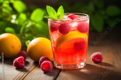 Enjoying a Chilled Glass of Raspberry Peach Lemonade Outdoors with Fresh Fruits Scattered Around on a Rustic Table