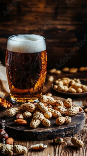 Enjoying a glass of amber beer with a bowl of salted peanuts on a rustic wooden table in a cozy setting