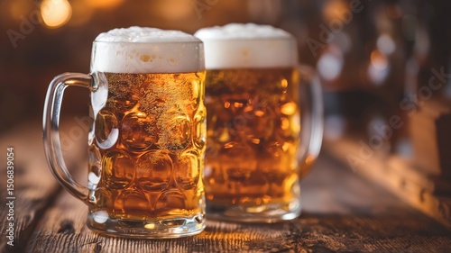 ai, beer, mug, bar, cosy, rustic, wooden, table, ambient, lighting, frosty, socialising, evening, drink, celebration, friends, brewery, enjoyment, atmosphere, craft, refreshment, beverage, tasting, party, gathering, nightlife, hop, laughter, company, adventure, relaxation, favor, refreshing, clinking, barley, foam, alcoholic, amber, bubble, pour, liquid, glasses, life events, local, culture, thirst, unwind, enjoy, conviviality