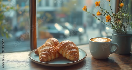 croissant, hot drink, cafes, morning, sunny, city, window, table, flower, pastry, breakfast, beverage, urban, tied-up, relaxing, wooden, enjoyment, warmth, comfort, tradition, aroma, culinary, casual attire, dining, social, atmosphere, peaceful, latte, cream, freshness, indulgence, snack