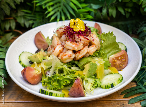 Ensalada gourmet de camarones y diferentes brotes verdes