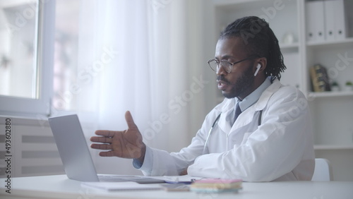 doctor, consulting, online, video, chat, check-up, earphones, modern, medicine, laptop, app, eyeglass, talking, conference, computer, medicals, consultation, technology, sitting, workplace, african american, working, physician, typing, black, male, healer, health care, application, cyberspace, distance, man, man, person, people, african, clinic, hospital, stethoscope, health, care, specialist, wireless, help, contraption, paediatrician, chatting