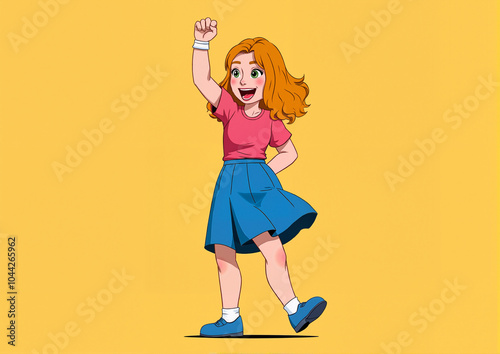 lass, empowerment, protest, strength, activism, confidence, feminism, equality, celebration, determination, cartoon, illustration, vibrant, positive, energetic, youth, solidarity, strong, inspiring, colourful, bold, pride, freedom, leadership, expressive, optimistic, motivated, oneness, spirited, advocacy, cheerful, character, animated