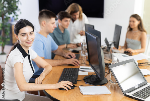 Enthusiastic young girl studying in computer lab with fellow students engrossed in coursework. Digital education concept..