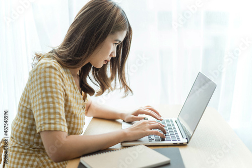 Entrepreneur concept a young female freelancer working on her laptop device typing an urgent document seriously