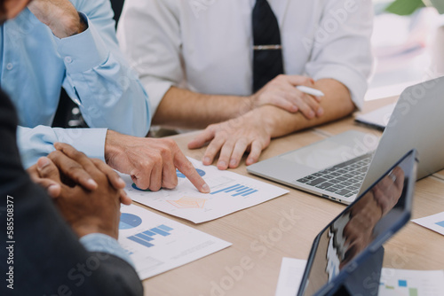 Entrepreneurs and business people conference in modern meeting room, happy multiracial coworkers have fun cooperating working together at office meeting, asian teamwork concept