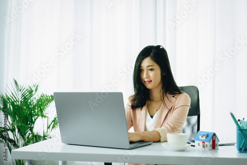 Entrepreneurs, business owners, accountants, real estate agents, Portrait of asian women using computer to calculate assess financial risks to buy house.
