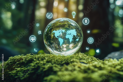 Environmental technology concept. Green Earth with Environment icons. Saving the environment
