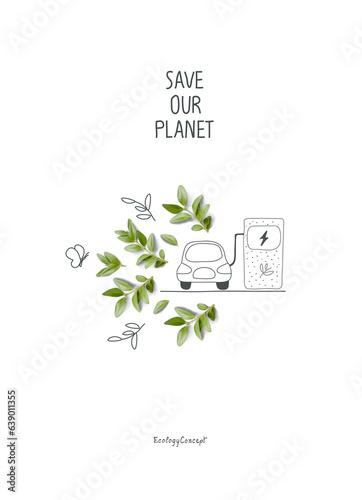 Environmentally friendly planet concept. Green sprouts leaves and a sketch of electro car on Car Charging Station. Think Green. Alternative energy concept.Transparent png.