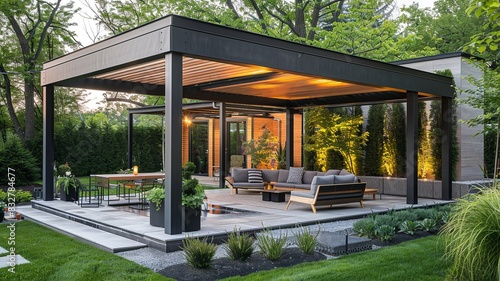 Envision a professionally designed pergola embellished with cascading vines, vibrant flowers, and lush foliage, crafting a serene and elegant atmosphere