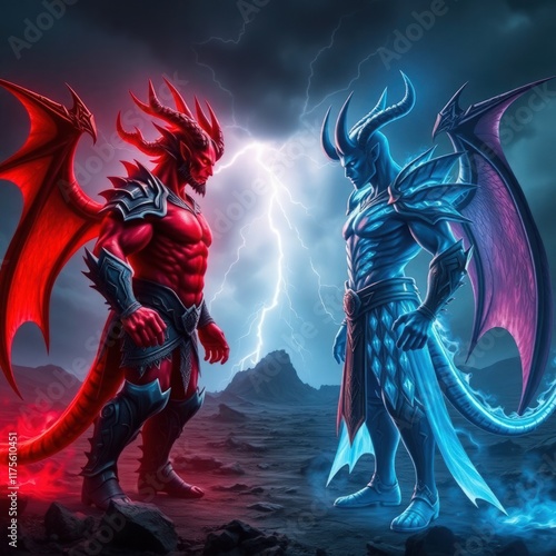 Epic Battle of Fire and Ice: Clash Between the Red Demon and Blue Devil Amidst a Stormy Sky. Devil and Angle