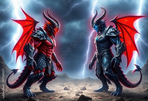 Epic Battle of Fire and Ice: Clash Between the Red Demon and Blue Devil Amidst a Stormy Sky. Devil and Angle