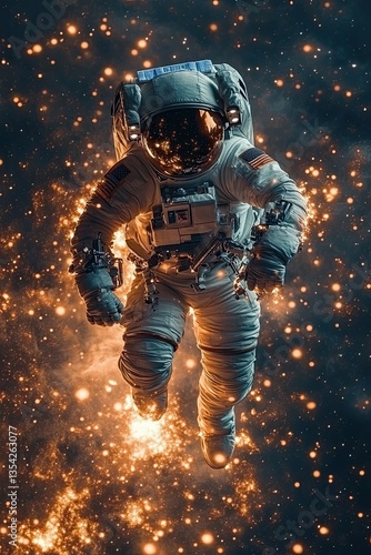 Epic view of astronaut or cosmonaut in spacesuit in space with stars, nebula and galaxy around him