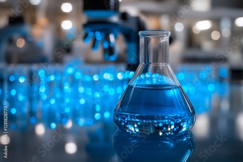 Erlenmeyer flask containing blue liquid stands on table in laboratory setting with microscope in background