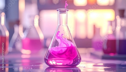 Erlenmeyer flask with vivid pink liquid and swirling vapor against dark background for editorial chemistry education scientific experimentation and visual science-themed visuals