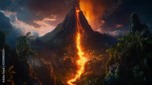 Erupting volcano at sunset, lava flowing down a tropical island.