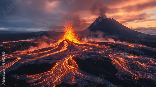 volcano, lava, eruption, mountain, sunset, sky, cloud, fire, nature, landscape, hot, magma, volcanic, rock, earth, red, orange, black, grey, dark, dramatic, powerful, destruction, creation, energy, force, geologic, phenomena, beauty, danger, awesome, spectacular, iceland, volcanism, geology, photo, aerial, view