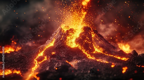 Eruption of a volcano showcasing exploding lava and magma Intense volcanic activity with flowing molten rock and billowing smoke Depiction of a natural disaster scenario