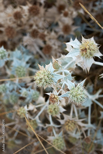 plant, green, grey, leaf, leaf, white, flower, inflorescence, in bloom, stem, prickly, spiny, thorny, foliage, closeup, blossom, blooming, coast, sand, sandy, uncultivated, natural, season, background, summer, flora, environment, nature, botany, botanical