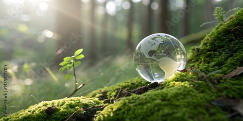 ESG, BCG, and SDGs Concept. A crystal globe rests gently on vibrant green moss, bathed in soft sunlight filtering through a lush forest.
