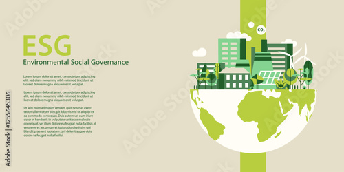 ESG concept banner, half of the planet with the city on top, ecological poster, vector illustration with copy space